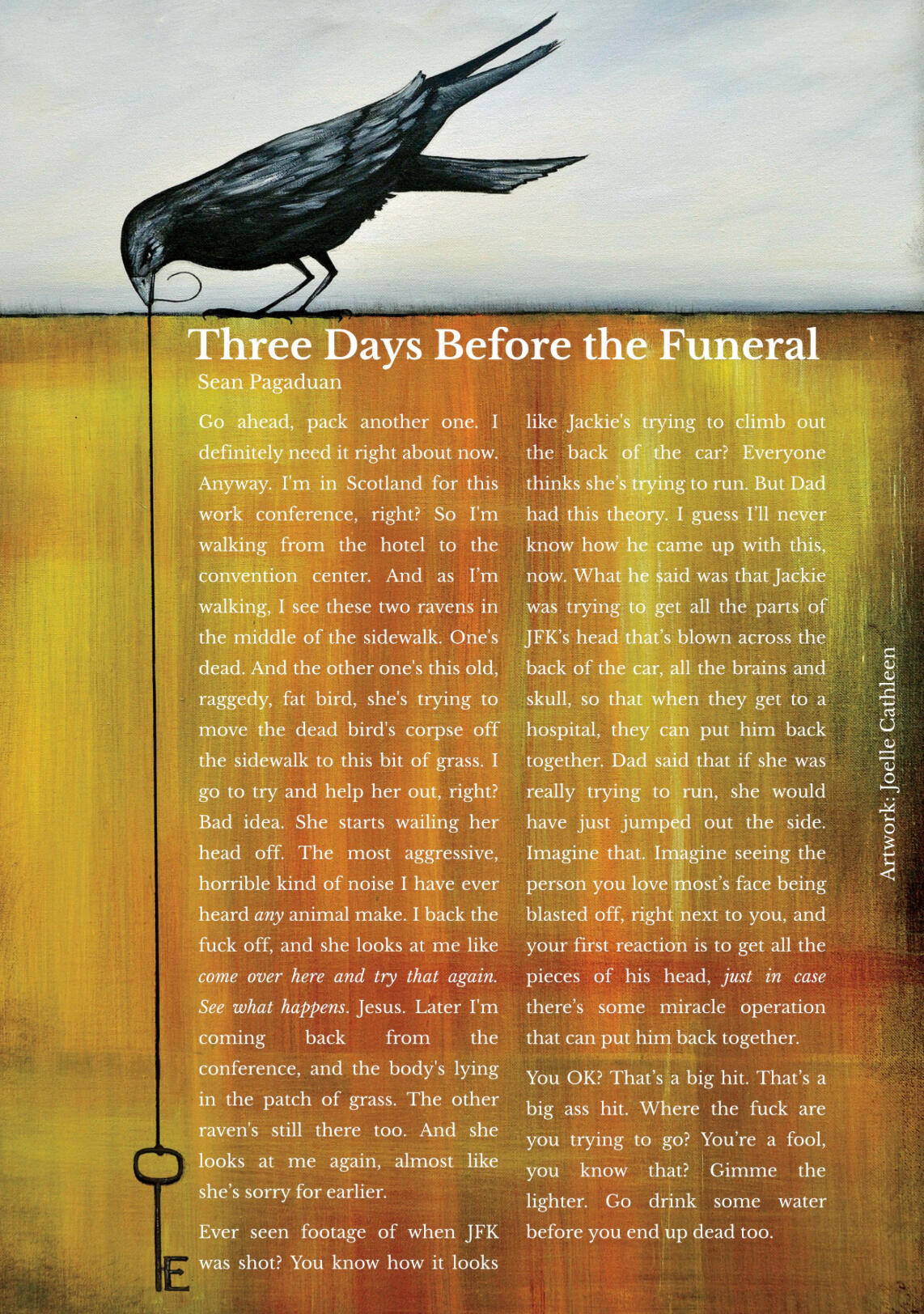 November 2020. Literary. Drug use, death. 354 words.Two grieving brothers share a bowl while trying to process the death of their father. One brother talks about other instances of death -- a dead raven he ran across once, JFK's assassination -- in an attempt to cope. Vignette, monologue.